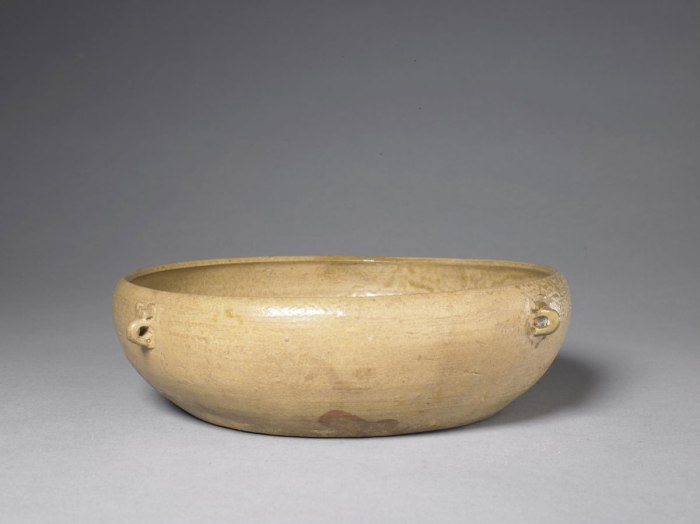 The ancient celadon glaze colours of excavated items have a different glaze colour compared to when they were just made. Due to ‘secondary oxidation’ the glaze turned brownish. See for example the celadon basin from the Eastern Han Dynasty below: