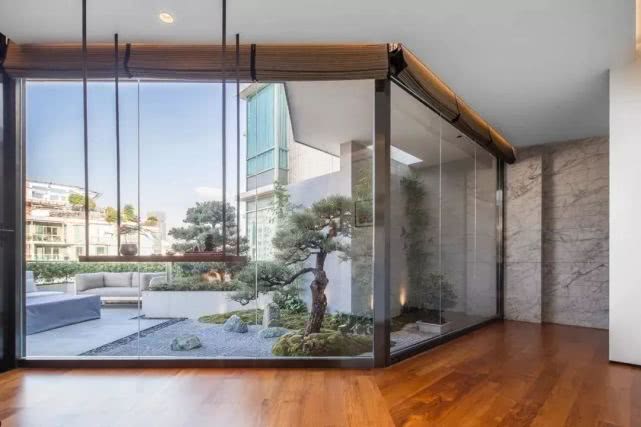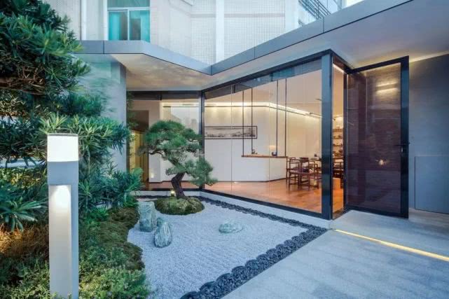 The courtyard is dotted with mosses, pine trees and ferns transported from Japan. Outdoor landscape lights shine directly from the bottom of the tree, and white walls reflect the lights and show shadows of the pine trees swaying at night.