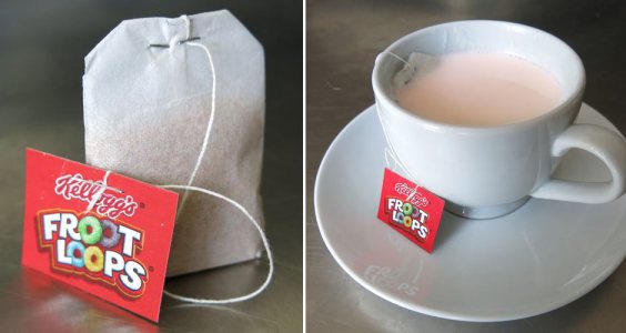 While it cannot be condoned to cannibalize tea bags as some people are doing, it is definitely an interesting concept. Whose to say real tea couldn’t be mixed in with this cereal tea? A black tea could pair very well with Frosted Flakes and a fruity blend could bring Trix to the very next level. Especially using hot milk, these could be very rich teas indeed and definitely an interesting sugary thing to raise a cuppa to.
